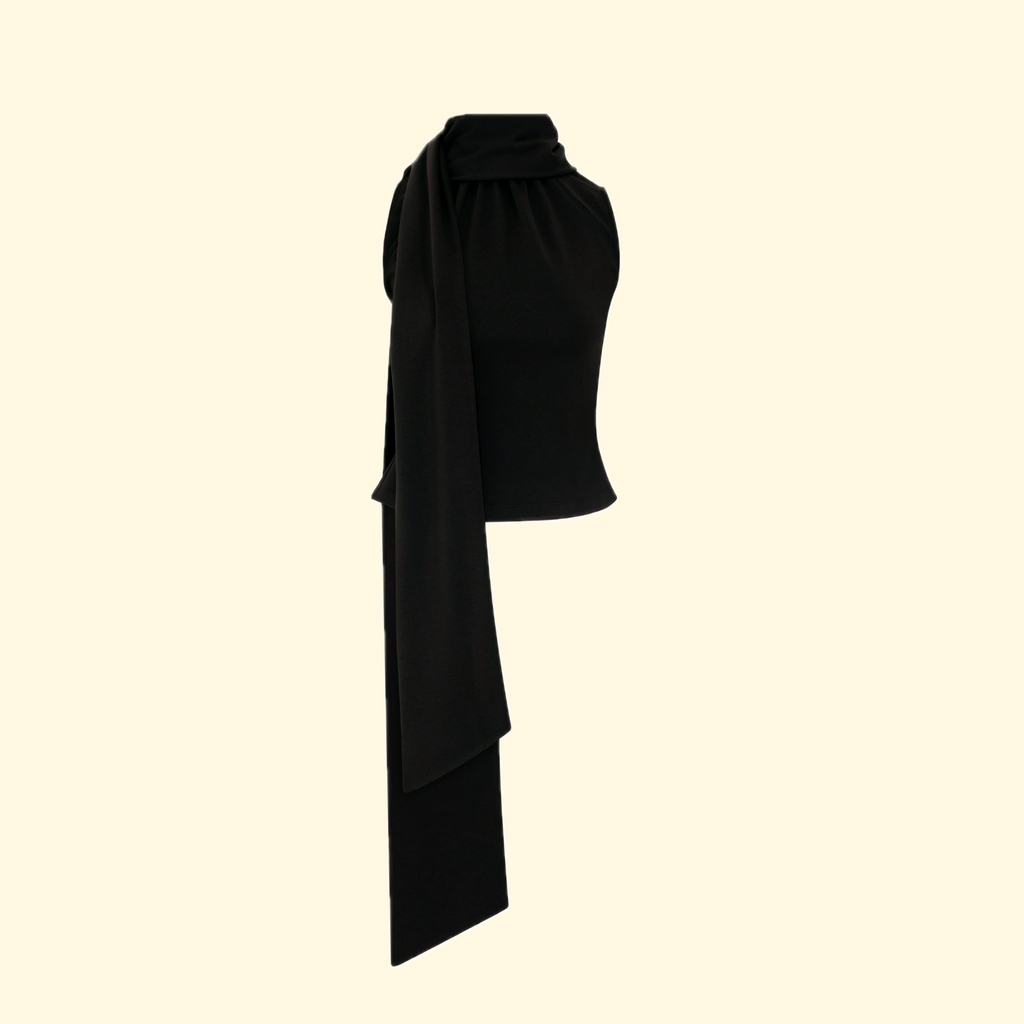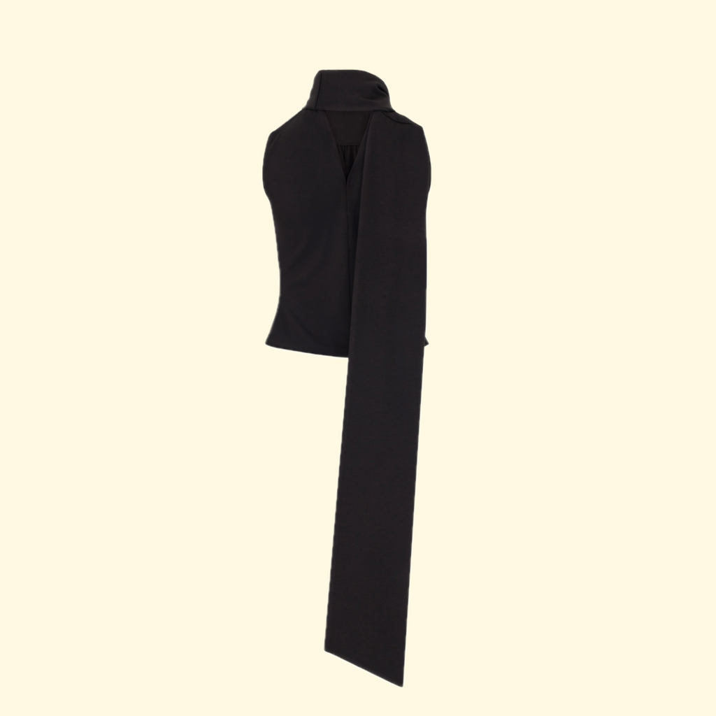 Önü büzgülü, drapeli yüksek yakalı, çeşitli şekillerde bağlanabilen uzun bağcıklı vücuda oturan kolsuz bluz. Arkada V şeklinde açıklığı bulunur.